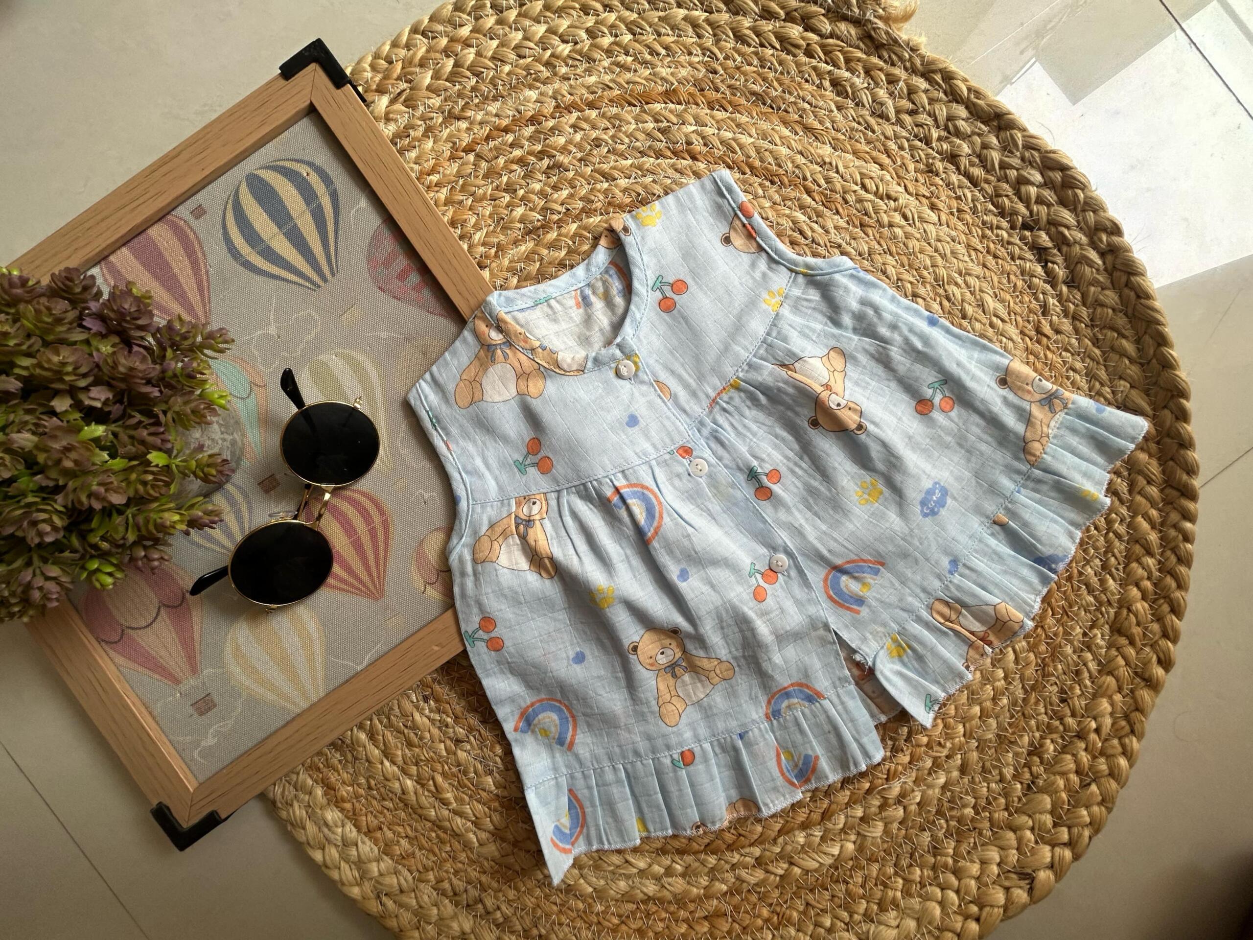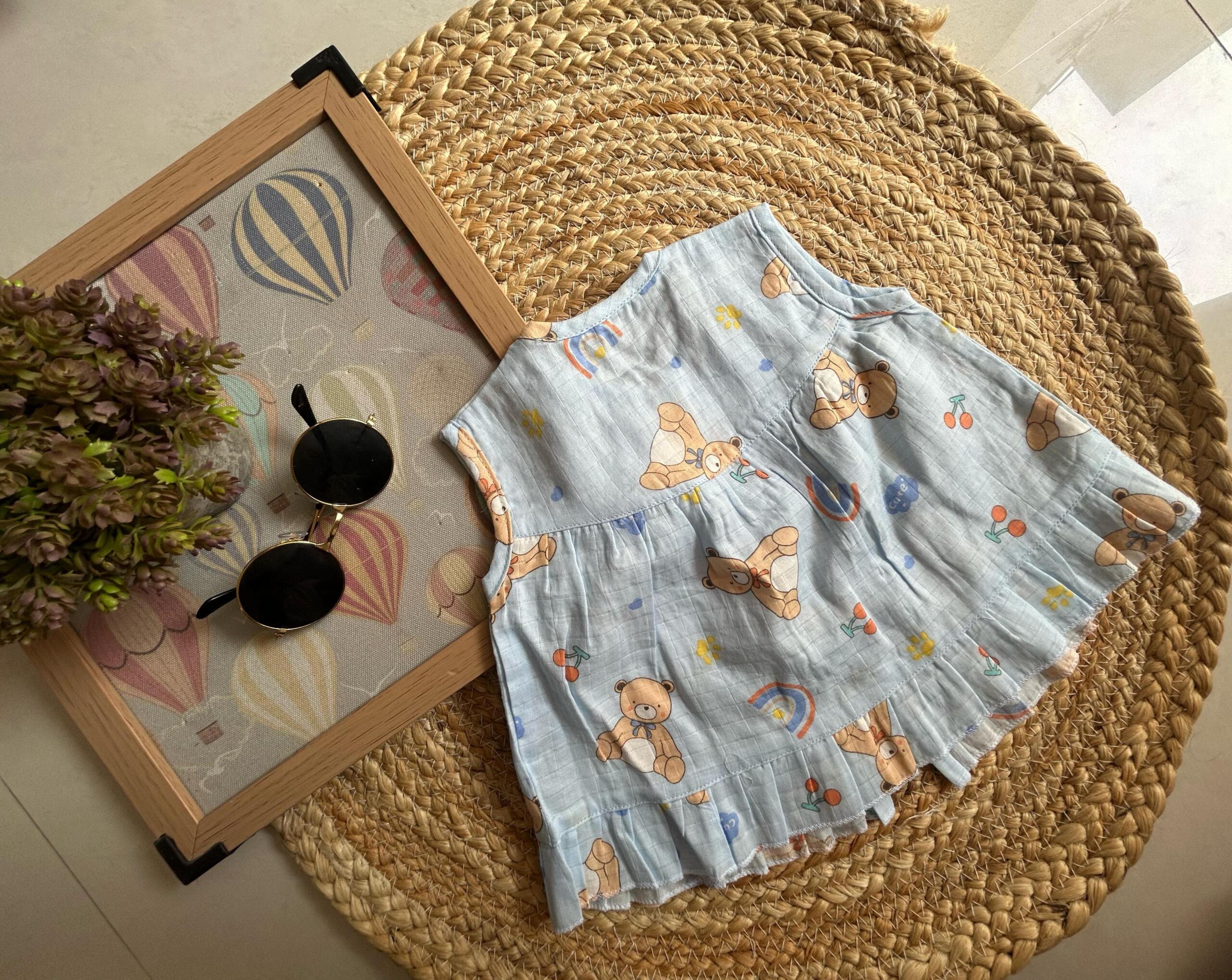 Keep your baby comfortable in this light blue muslin frock with a cute teddy print, designed for ages 0 to 6 months. Made from 100% breathable cotton muslin, it’s soft on delicate skin. The front button design allows easy dressing, while the teddy print adds a playful, adorable touch.